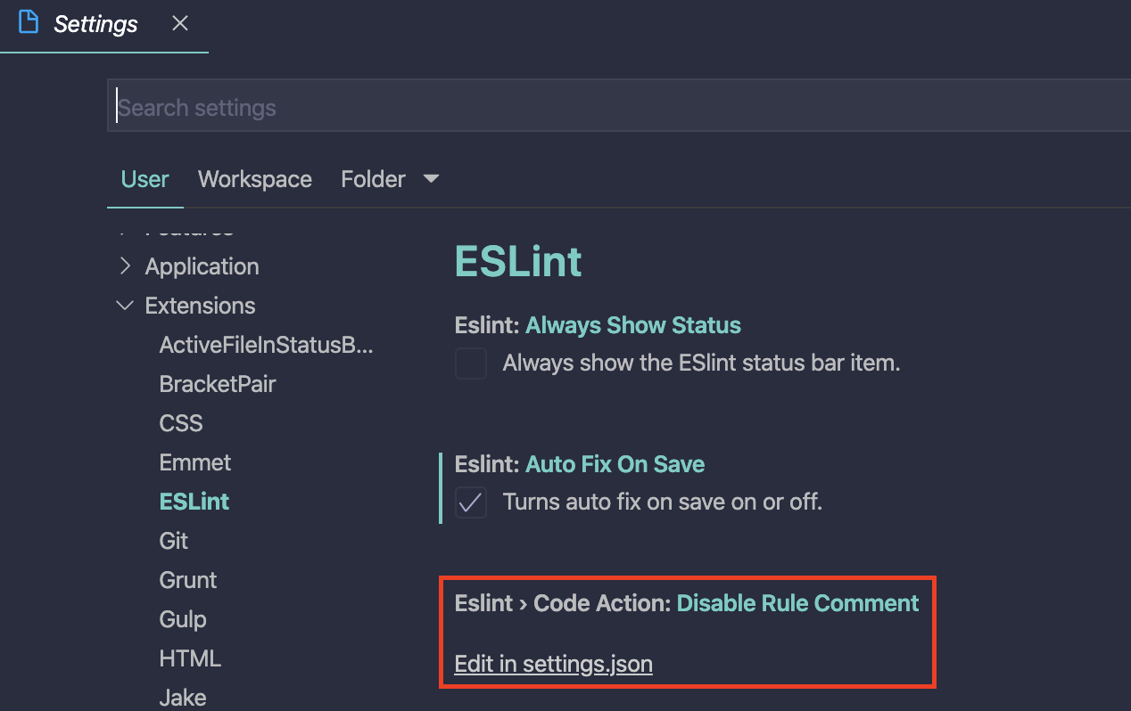 vscode에서 코딩하면서 eslint 규칙 적용하여 보고 싶은 경우 settings에서 수정해주면 된다.