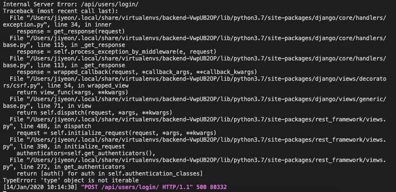 ... 생략 ... File "/Users/jiyeon/.local/share/virtualenvs/backend-VwpUB2OP/lib/python3.7/site-packages/rest_framework/views.py", line 272, in get_authenticators |