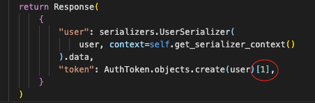 Response 시 결과물이 튜플이고 첫번째는 인스턴스 그리고 두번째가 토큰이 러턴값으로 나오기 때문에 두번째 것을 사용할 수 있도록 해야한다. (참고)