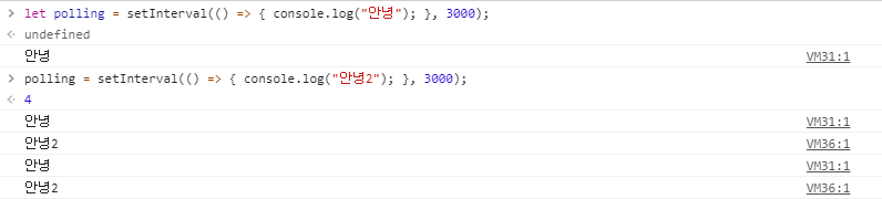 polling = setInterval(() => { console.log("안녕2"); }, 3000);