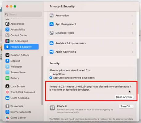 `시스템 설정 → 개인정보 보호 및 보안` 에서 스크롤 내리다 보면 MySQL~ 쓰여있는 부분이 있습니다. Open Anyway 누르고 비밀번호 입력하면됩니다. ( 이미지는 제가 깜빡하고 캡쳐를 못해서, 다른 곳에서 캡쳐했습니다. )