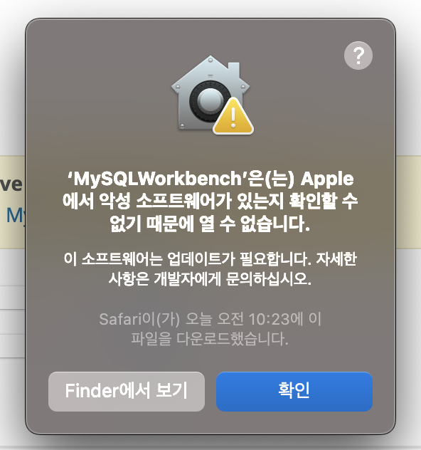 이제 다운 받은 dmg 파일 열면, "'MySQLWorkbench'은(는) Apple에서 악성 소프트웨어가 있는지 확인할 수 없기 때문에 열 수 없습니다" 라는 메세지가 나옵니다.