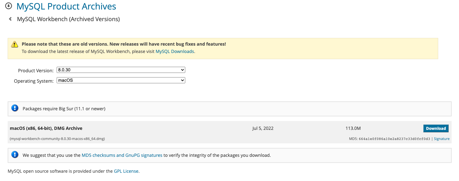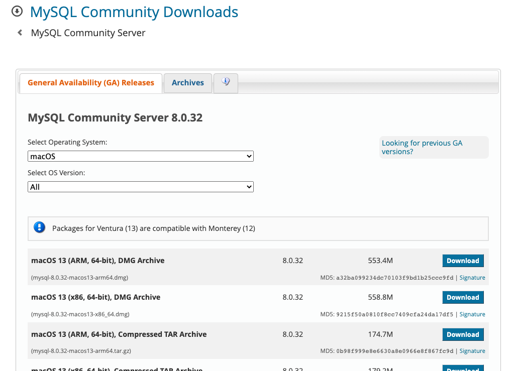 MySQL Community Server 설치 페이지에 보면 macOS 버전을 선택하는 옵션이 따로 있는 것을 보면,
