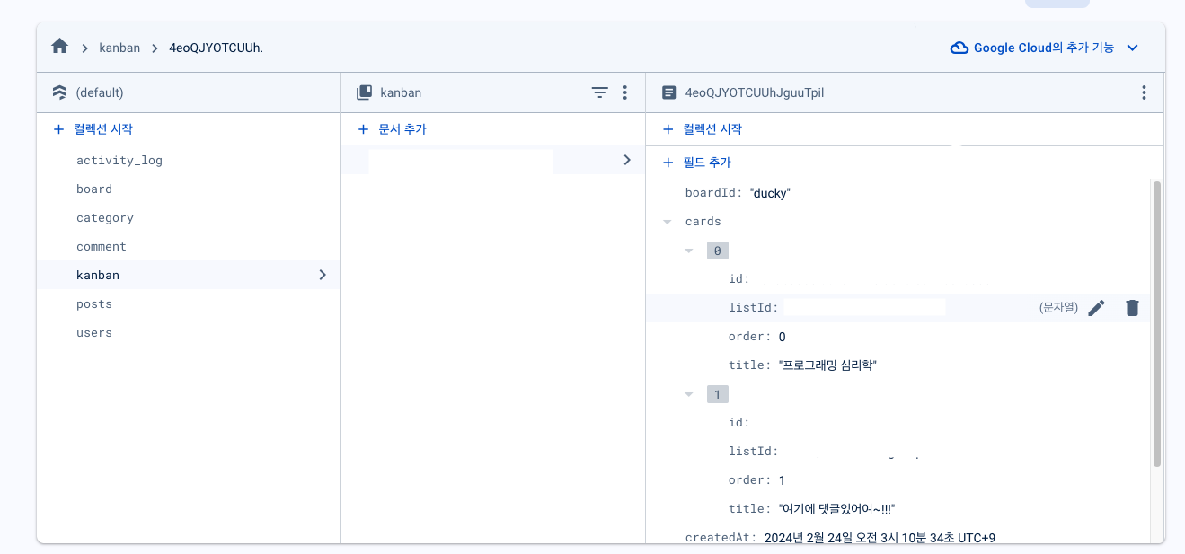 저장소 페이지에서 리스트와 카드의 관계를 어떻게 구현할 지 가장 큰 고민이었다. 파이어베이스에서 하위 컬렉션 접근이 안된다는 것을 알았기 때문에 리스트(kanban)에 cards라는 배열 필드를 추가하고, 카드가 추가되면 cards에 추가하는 형식으로 구현했다.