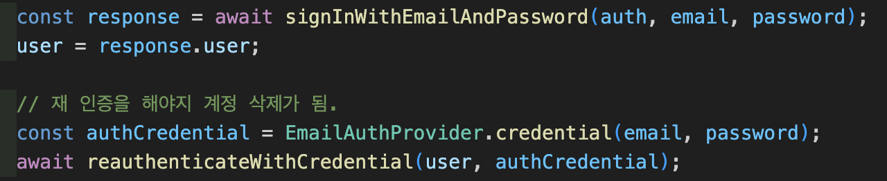왜 이곳에 넣었냐면, auth.currentUser에는 사용자의 패스워드 정보가 없기 때문에 인증정보를 갖고 올 수 없다. 그래서 이미 로그인 이후에는 재인증이 불가능하기 때문에 로그인할 때 바로 재인증하도록 하였다.