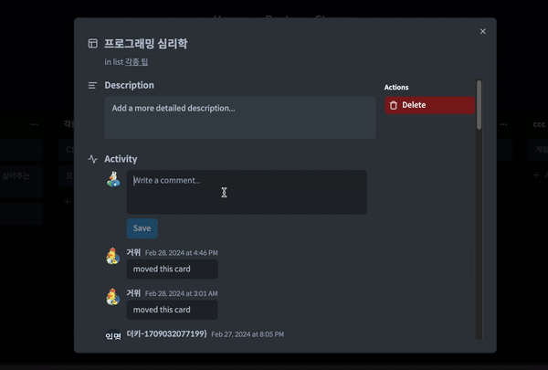 - hello-pangea/dnd : 드래그 앤 드롭 라이브러리. 칸반보드에서 카드나 리스트 옮길 때 사용.
