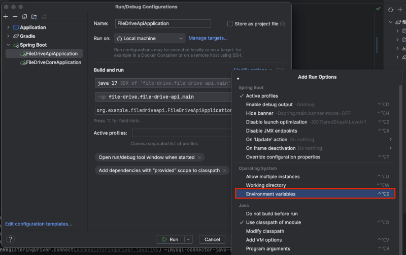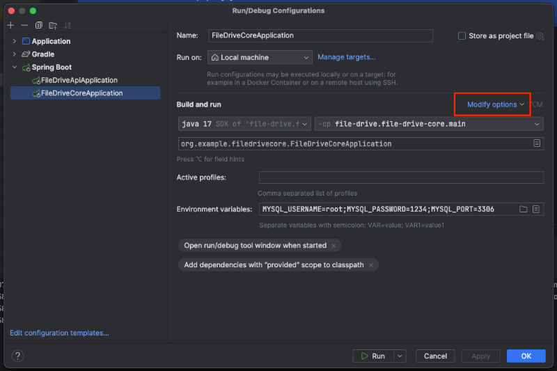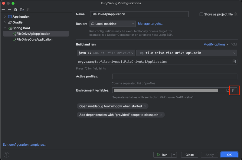 정보를 환경변수에 선언했기 때문에 평소와 같이 IntelliJ에서 실행하면 스프링이 숨겨진 값을 알 수 없기 때문에 실행이 안됩니다. 실행 설정을 변경해야 합니다.