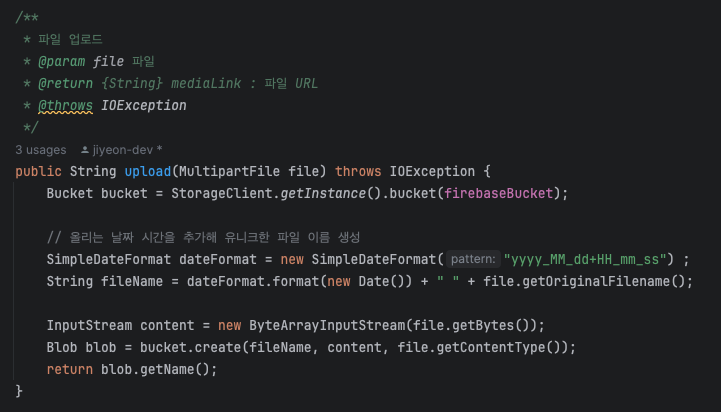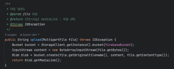 파일 객체를 서버에 넘겨주면 스프링에서는 아래 코드와 같이 해당 파일을 Storage에 올리고 생성된 파일 링크를 반환하여 디비에 넣어주도록 코드를 설계했다.