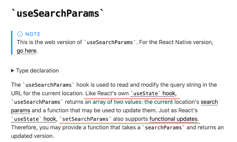 이때, "이거 useState 같은 상태 관리 훅 같은데🤔?" 라는 느낌이 들어서 관련 문서를 찾아보았다. 아니나 다를까, 공식문서에도 useState와 같이 setSearchParams를 이용해서 업데이트 할 수 있다라고 명시되어 있었다.