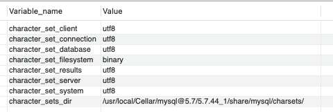 그래서 또 삭제하고 더 이전 버전인 5.7 버전도 설치해 보았고, 이것도 역시 안되었다. 😡 my.cnf에 인코딩 설정을 안해줘서 그런가 싶어서 5.7 버전일 때 character_set 을 조회해 보니 설정을 안해줘도 다 utf8로 되어 있었다.