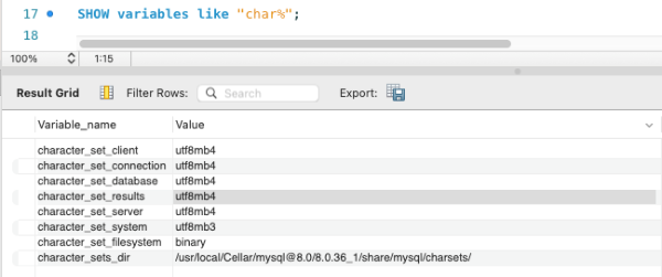 MySQL 인코딩이 문제인가? 싶어서 character_set을 조회해봤지만 utf8mb4로 되어 있었다.