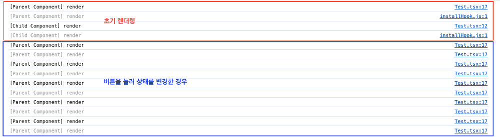 - Child Component를 생성한 부모 컴포넌트인 Test Page 컴포넌트는 리렌더링되지 않았다.