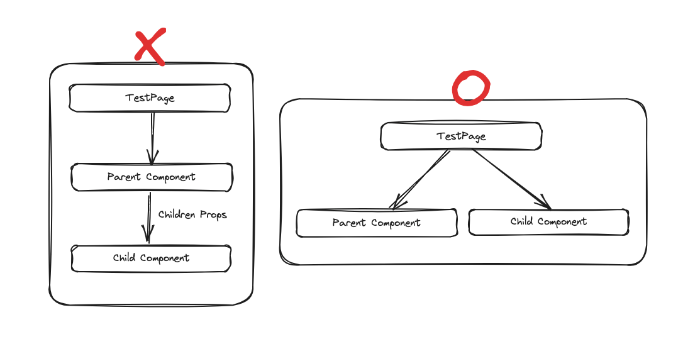변경해보니 child component는 변경이 안 되는 이유를 확실히 알 수 있었다. 자식 컴포넌트 생성은 ParentComponent가 아닌 TestPage에서 생성 후 전달해 주고 있었다. 왼쪽은 내가 생각했던 컴포넌트 생성 구조였고, 실제로는 오른쪽과 같았다.